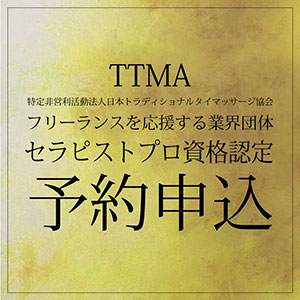 【TTMAプロセラピスト資格認定】は、こちらのページからお申し込みください。【TTMAマッサージスキル検定】で【技能検定合格証】があれば、その場で認定を受けることができます。【TTMAマッサージスキル検定】と一緒にお申し込みください。